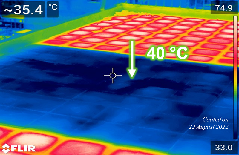 根据实际检测显示,屋顶在没有无电制冷涂层区前表层温度达到66.2℃,通过无电制冷涂层覆盖后的区域,表层温度仅达到35.7℃。检测结果得出屋顶表面最高温度实现降温30℃,室内空气降温6℃。“该项目实验2021年5月开始,已经历数次8号风球,制冷效果依然维持良好,并将持续检测中。无电制冷涂层在中国内地及香港专利认证并通过RoHS和Reach有害物质测试及符合欧盟标准。” 由于今年全球暖化因素影响,气温持续酷热,该技术的制冷效果更加明显,甚至在8月份于香港录得40℃的降温效果。