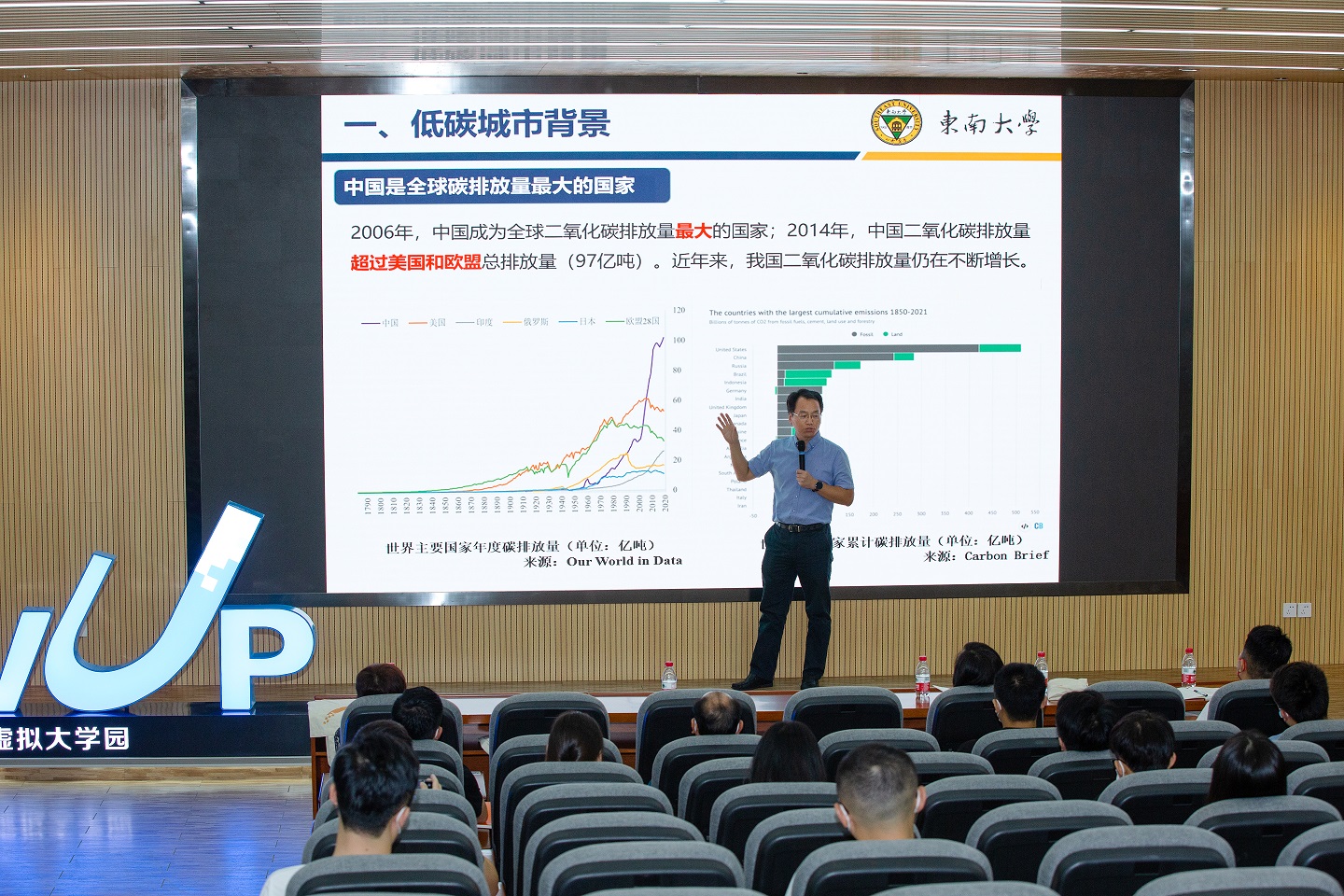 讲座上李德智院长通过列举国内外碳排放量的详细数据,以及对自然环境、气候变化等带来的影响,告诉我们为什么要减少二氧化碳的排放。同时也通过数据展示了在全球碳排放进程中,城市扮演了重要角色。李德智院长表示从全球的角度来说,城市地区所排放的二氧化碳占总量的比例大概是75%左右。中国城市地区占的比例更高一些,占比在80%左右,主要来源于城市经济、城市建筑和城市交通等领域的人类活动。因此,城市发展的低碳化在全球的碳减排中具有重要意义,它意味着城市经济发展必须最大限度地减少或停止对碳基燃料的依赖,实现能源利用转型和经济转型。作为区域碳减排的重要单元和研究主体,城市是实现全球减碳和低碳城市化的关键所在。