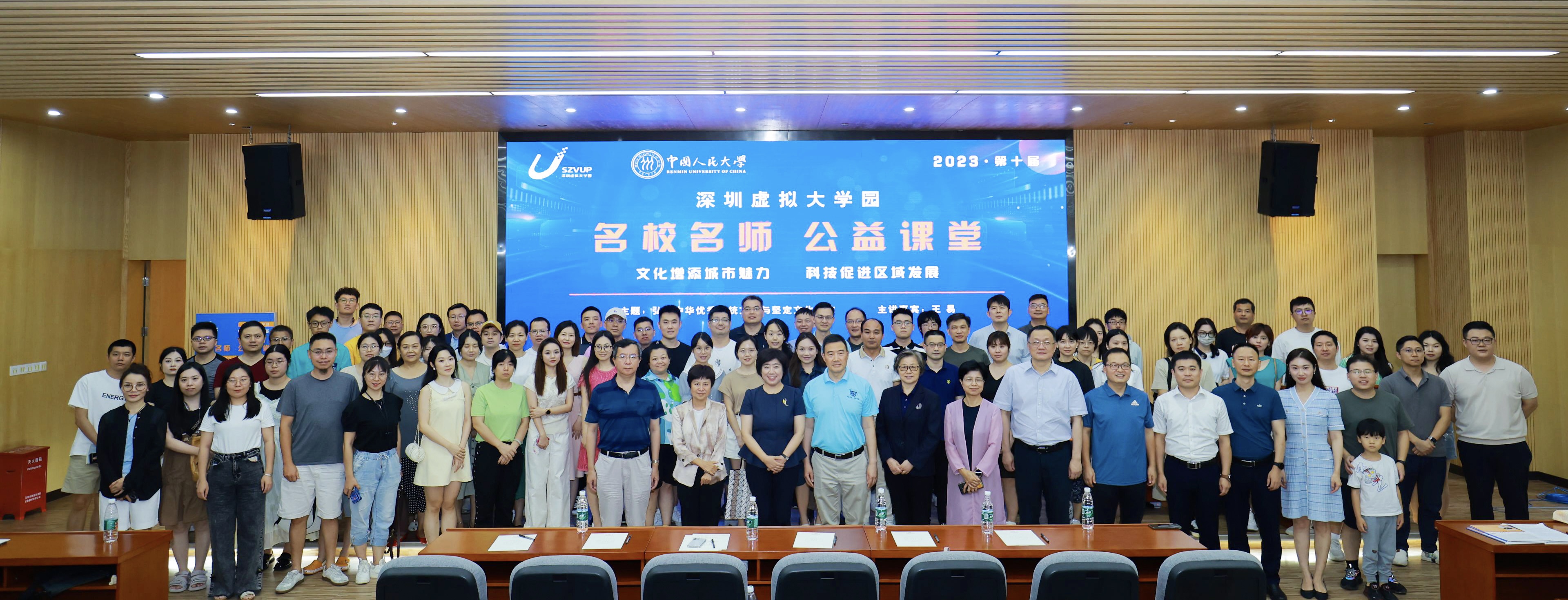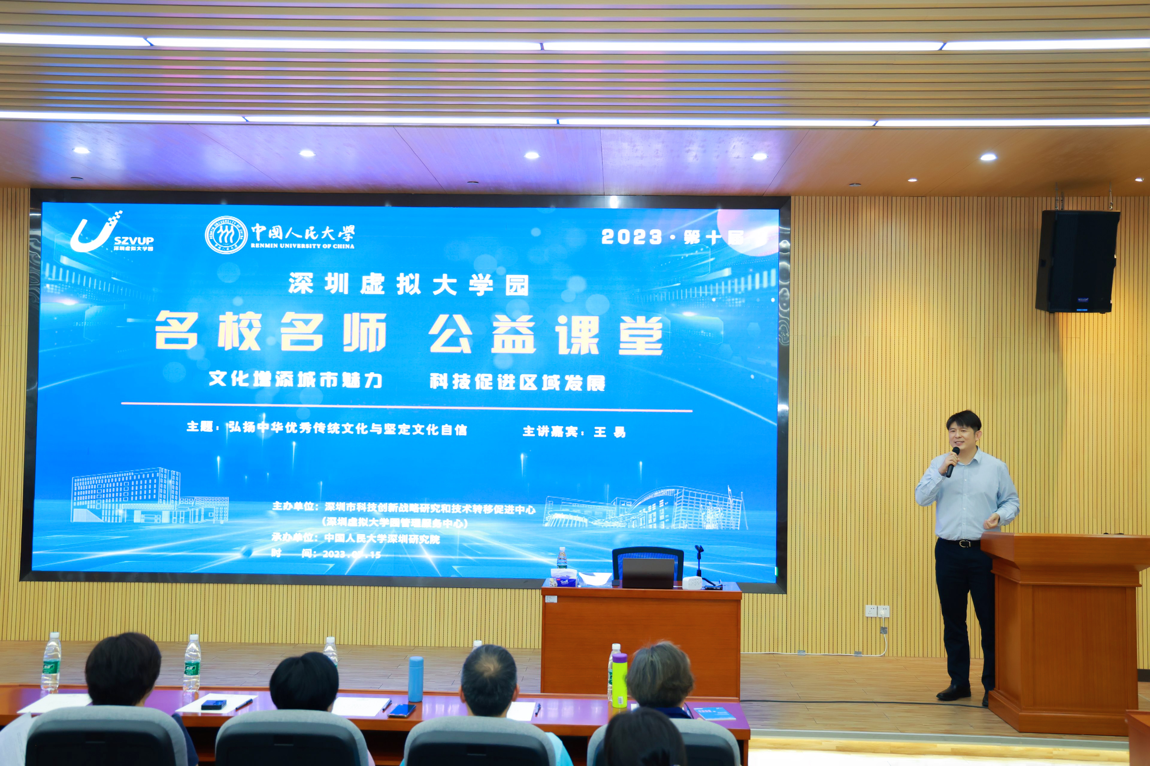 7月15日,由深圳市科技创新战略研究和技术转移促进中心(深圳虚拟大学园管理服务中心)<以下简称“创新中心”>主办、中国人民大学深圳研究院承办的深圳虚拟大学园第十届名校名师公益课堂在深圳虚拟大学园开讲,中国人民大学党委常委、副校长王易教授作题为《弘扬中华优秀传统文化与坚定文化自信》专题讲座。创新中心主任陈蓉,中国人民大学深圳研究院常务副院长吕捷、副院长毕明阳,以及来自兄弟院校的师生代表、人大在粤各界校友等200余人参加活动。活动由吕捷主持。