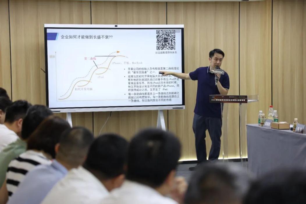 中山大学信息管理学院教授彭国超,进行了主题为《时代型组织:浅谈企业长盛不衰的奥秘》的分享。彭教授首先解释了什么是时代型组织,分享了在不同阶段处于领导者的老板、企业家、思想家的概念。企业正如人的生命周期一样,有婴儿期、青春期、盛年期和衰老期,如何无惧时代变迁,长盛不衰?彭教授用美国通电器(GE)的案例分解,尽可能地延长企业的盛年期,并给出图表及时识别出企业由盛转衰的关键特征。企业在第一曲线达到顶峰即将向下走时,何时启动第二曲线需要理性分析和想象力。最后,介绍了中小企业成长的另一种选择——隐形冠军,是企业家们向往的神级存在。