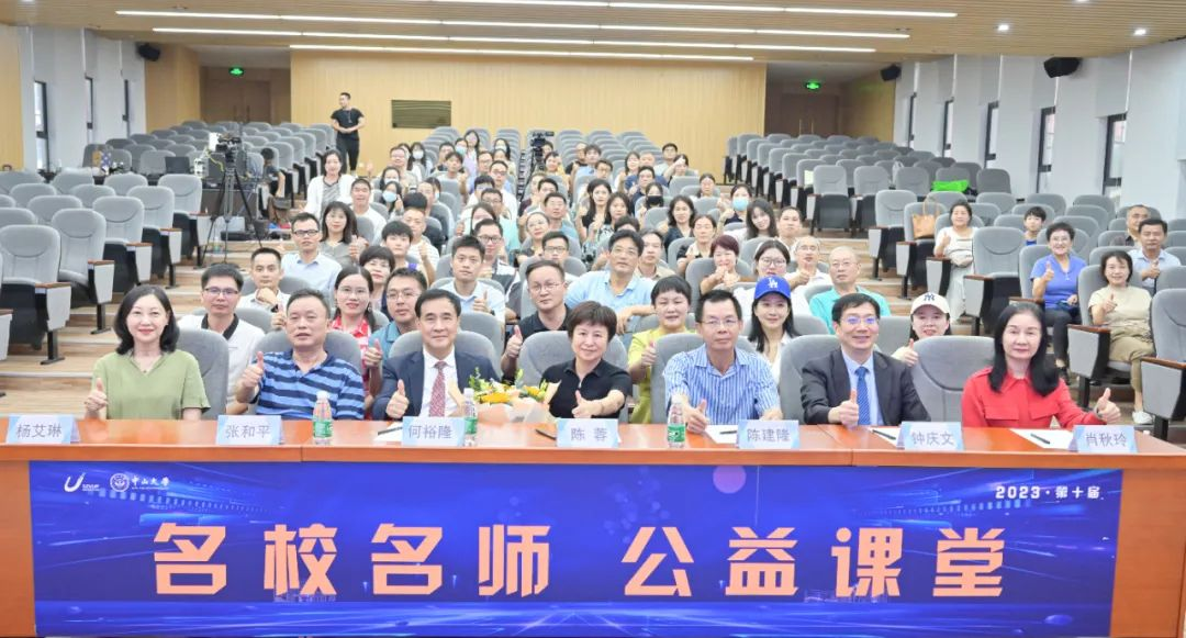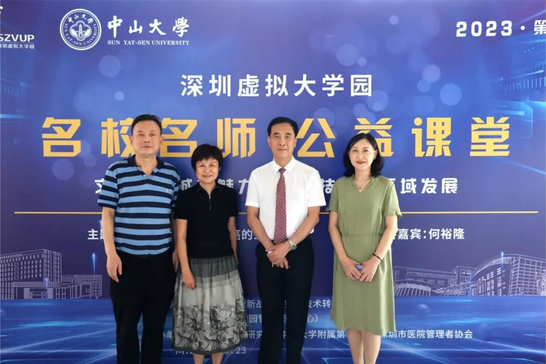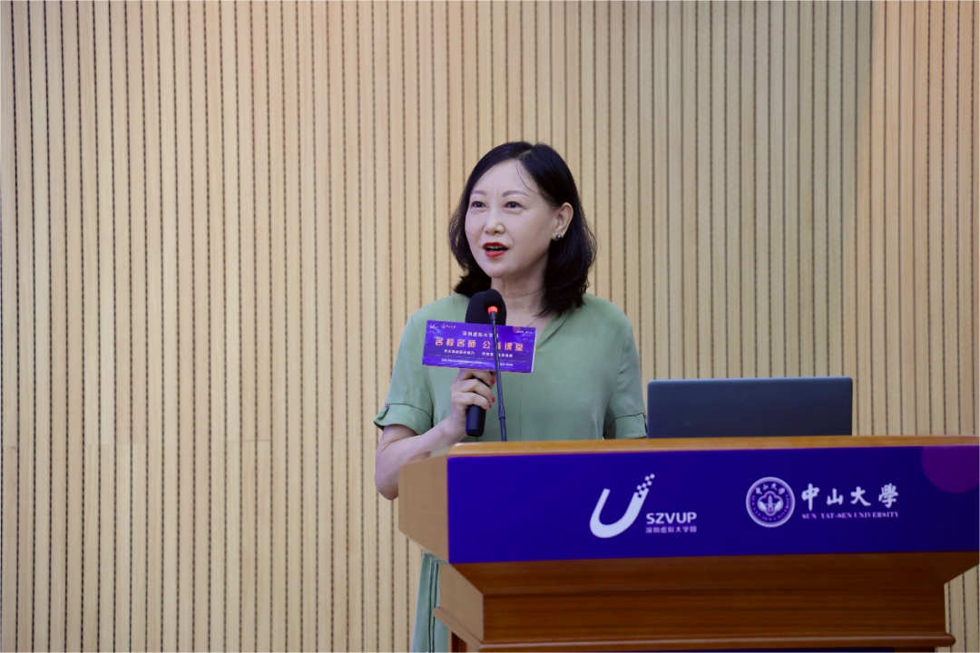 中山大学深圳研究院执行院长杨艾琳为本次公益讲堂致辞。她介绍自2014年起,深圳虚拟大学园已连续举办九届名师公益课堂,累计吸引上万名听众线下听课,数十万听众在线收听,获得广泛好评。