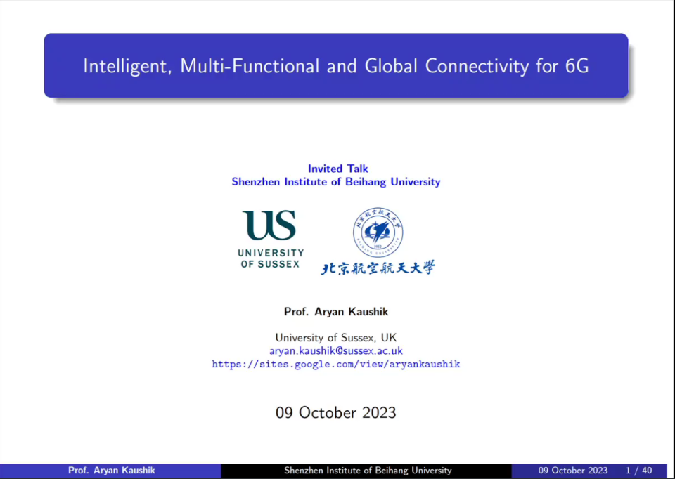 英国萨塞克斯大学Aryan Kaushik教授做了主题为Intelligent, Multi-Functional and Global Connectivity for 6G的报告。来自北京航空航天大学和各高校院所的专家、老师、同学60余人在线参会。论坛由北航深圳研究院赵岭老师主持。
