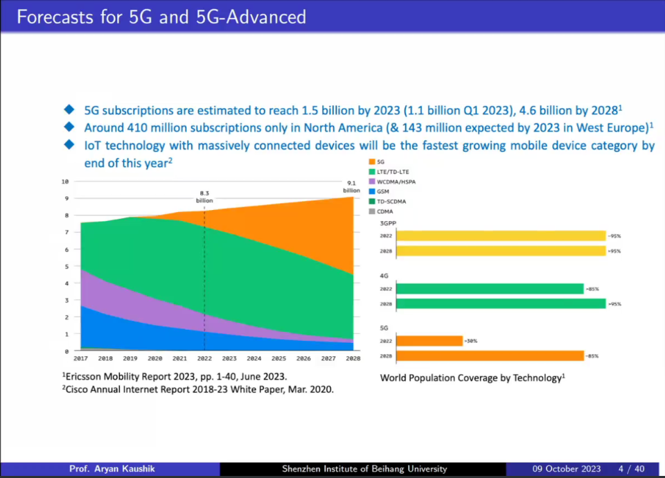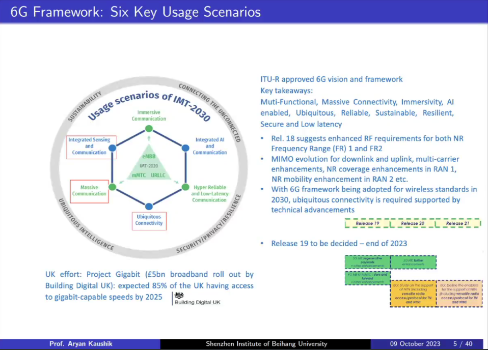 Aryan教授首先介绍了对5G-Advanced和6G通信的预测,包括其标准化的愿景、用例和指标。其次,Aryan教授提供了有关6G最新进展和关键技术推动因素的见解,例如用于智能电磁信号和信息论驱动通信的可重构智能表面、用于多功能连接的感知通信一体化技术以及用于全球连接的基于非地面网络的物联网解决方案,其中还包括了利用机器学习、人工智能和边缘计算方法的使用场景,以及这些重要技术在相关应用场景中的相互作用。