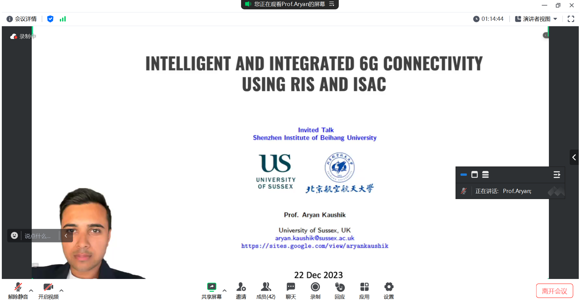 本次论坛邀请英国萨塞克斯大学(University of Sus***)的Aryan Kaushik教授作了题为“Intelligent and Integrated 6G Connectivity using RIS and ISAC”的主旨报告。来自北京航空航天大学和各高校院所的专家、师生以及空天领域的企业家等50余人在线参会。论坛由北航深圳研究院副研究员赵岭老师主持。