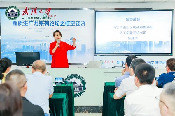 乐丽华书记率先致辞。她指出,南山区是高新技术企业的集聚区、活力区,新质生产力为南山区GDP做出了重大贡献。南山区在发展低空经济方面,需要整合上下游产业的多方力量和优势资源,因此,南山区特别看重人文底蕴与科创能量兼具且十分深厚的百卅名校——武汉大学,非常欢迎武大毕业生及校友企业到南山区工作、扎根、创业。