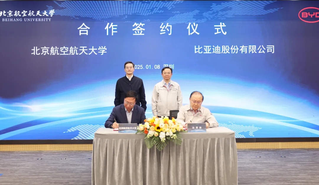 比亚迪集团首席科学家、汽车总工程师、汽车工程研究院院长廉玉波和北航副校长吕金虎分别代表双方签订合作协议。比亚迪集团董事长兼总裁王传福,北航校长王云鹏出席签约仪式。