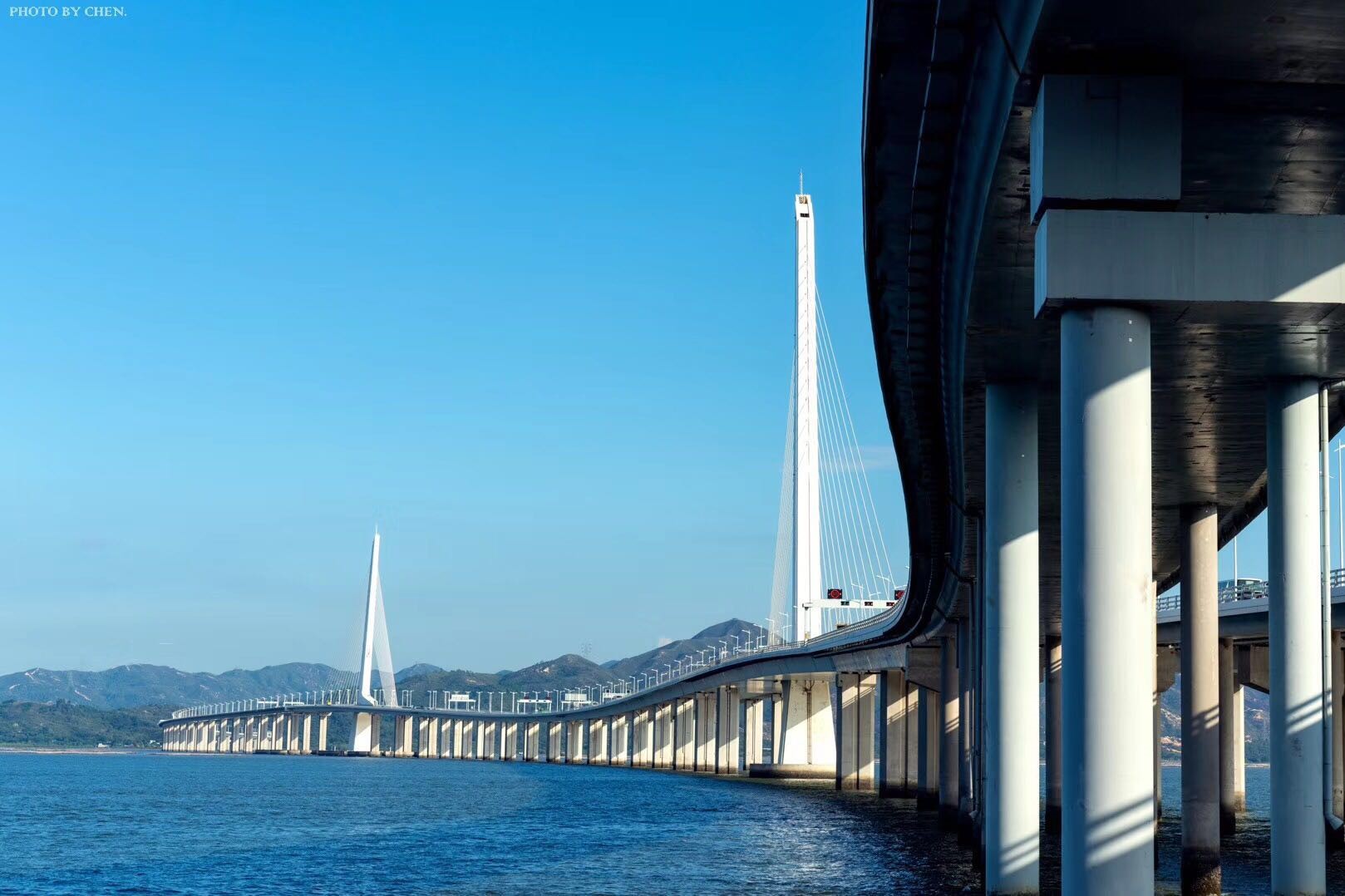 连接深圳蛇口东角头和香港元朗鳌堪石的深圳湾大桥,如一座银色通道蜿蜒逶迤飞架海上,阳光下耸立的斜拉桥熠熠生辉,象征着深港两地的紧密握手。极目远眺,长桥卧波,未云何龙