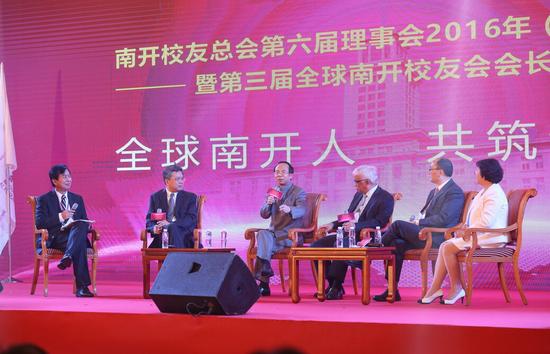 龚克,南开校友总会副理事长、南开深圳校友会会长、昆仑集团董事长周达,南开校友总会副理事长、南开香港校友会会长、香港长弓集团董事长张舜尧,南开波士顿校友会理事长、麻州开发融资局金融分析师王忠,南开洛杉机校友会会长、美国乐园国际实业公司董事长温桂芃作为嘉宾,分别围绕主题进行发言。