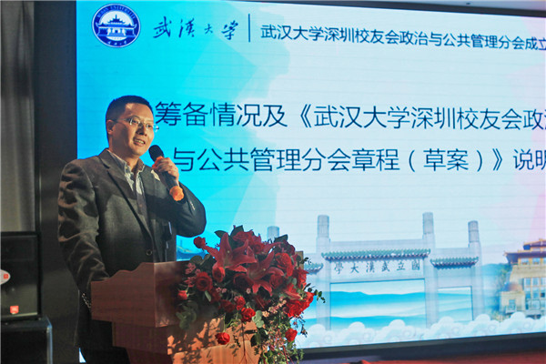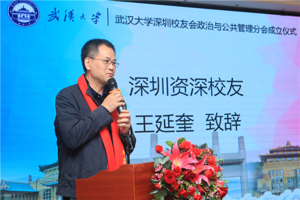 王延奎校友对政管分会的成立表达了诚挚的祝贺,向为政管分会筹备付出诸多心血的筹备组表达了衷心感谢。他表示,政管分会的成立为全体在深圳奋斗的政管校友找到了精神家园。希望每位校友都能拿出真心和真情投入到校友会的活动中来,将政管分会打造成为武汉大学的名牌校友会。