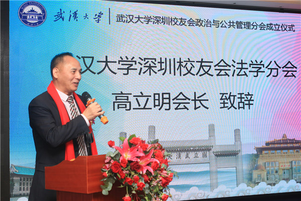 高立明校友代表武汉大学深圳校友会法学分会对政管分会的成立致以祝贺。他表示,校友会精神要义在于迎接“新”校友,不忘“老”校友,依靠“大”校友,帮助“小”校友,捆绑“富”校友,帮助“穷”校友。希望政管分会与法学分会齐心协力,团结互助,共同推进深圳校友们的成长发展。