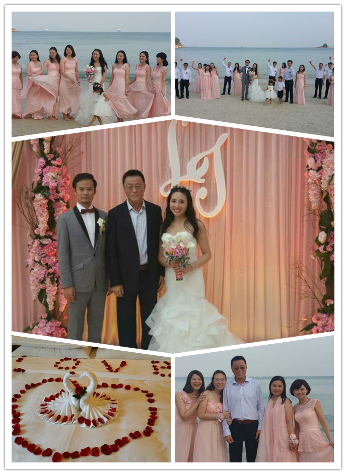 新娘吉蕾和新郎刘俊2012年入读南开大学,在拓展及学习过程中,两人结下深厚情义,随着学习的进程,两人感情愈加深厚,在毕业7个月后领取了结婚证。这段感情的见证人---南开大学深圳研究院赵雨清院长应邀出席婚礼。作为证婚人,赵院长深情地说:“当年你俩以南开为荣,今日南开以你俩为荣。”并将陈洪副校长撰文范曾先生丹书的“百年南开”的书简赠送两位新人,衷心祝愿新娘新郎百年好合。另赠予两个金瓶:一个印着南开校徽,一个刻印着桃花---赋予桃花盛开,祝福:新娘“才德妇人价值胜过珍珠”,新郎“拥抱智慧,使你尊荣。”作为姐妹团,南开大学金融班还有和新人们共同学习的四位同学前来祝贺。